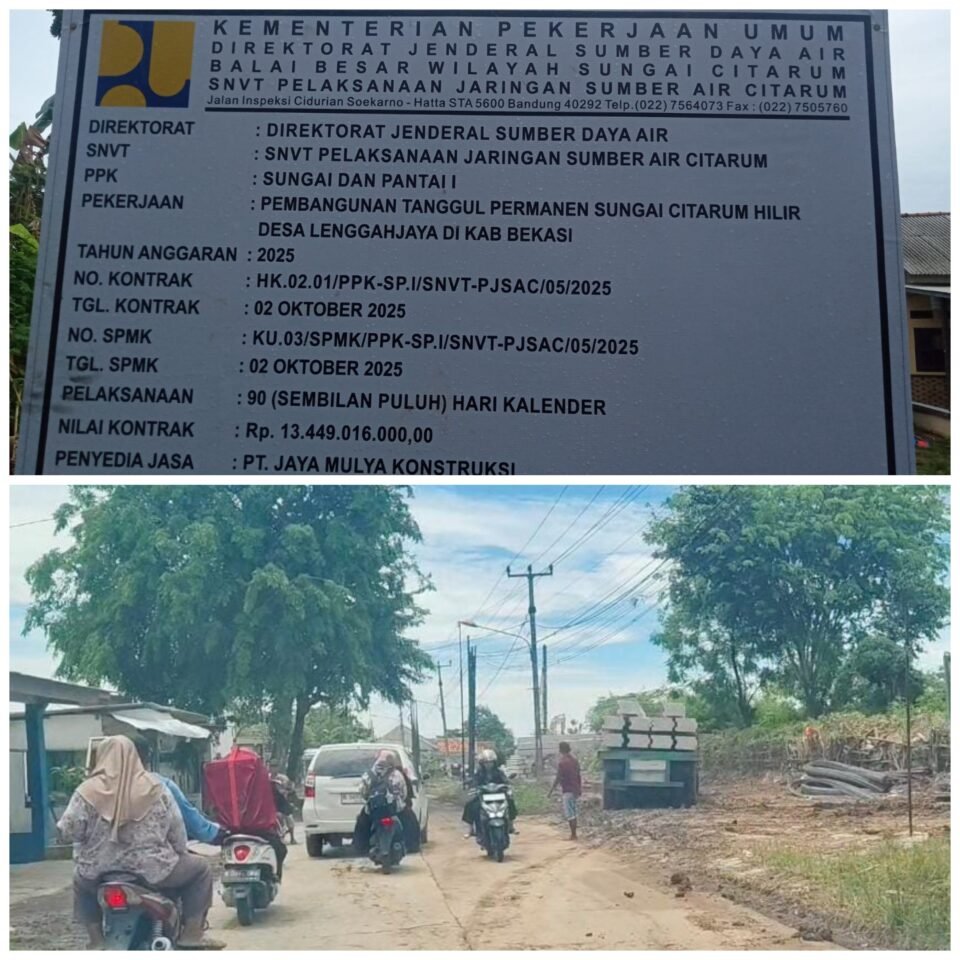 MANUVERNEWS.COM | BEKASI — Aktivitas mobilisasi alat berat dan tiang pancang proyek Pembangunan Tanggul Permanen Sungai Citarum Hilir di Desa Lenggahjaya, Kecamatan Cabangbungin, Kabupaten Bekasi, menuai keluhan keras warga. Proyek senilai Rp13,4 miliar yang dikerjakan oleh PT Jaya Mulya Konstruksi ini dinilai menimbulkan dampak negatif terhadap keselamatan pengguna jalan dan kebersihan lingkungan sekitar.